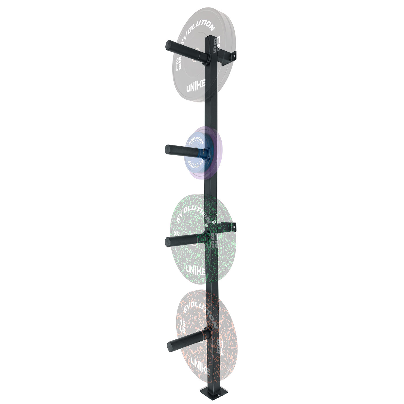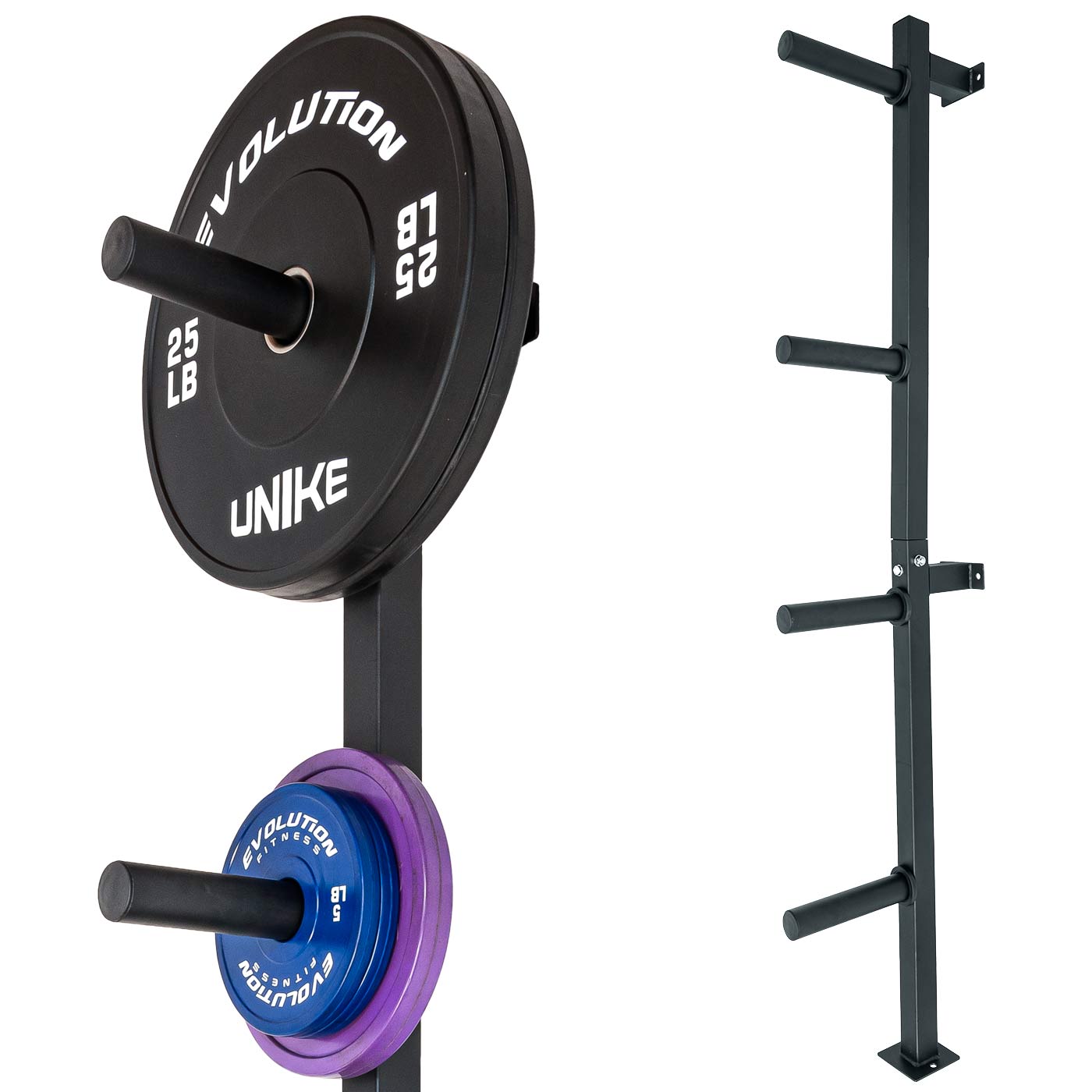 El rack de pared para discos olímpicos UNIKE cuenta con 4 soportes de gran resistencia y capacidad; es una solución práctica de almacenamiento, compacta y duradera para organizar sus discos de pesas en el gimnasio o espacio de entrenamiento casero. Montado en la pared, ahorra espacio y ofrece máxima accesibilidad, manteniendo sus discos organizados y seguros, evitando tropiezos y desorden en el piso del gimnasio. Ideal para gimnasios con espacio limitado y necesidades de organización.